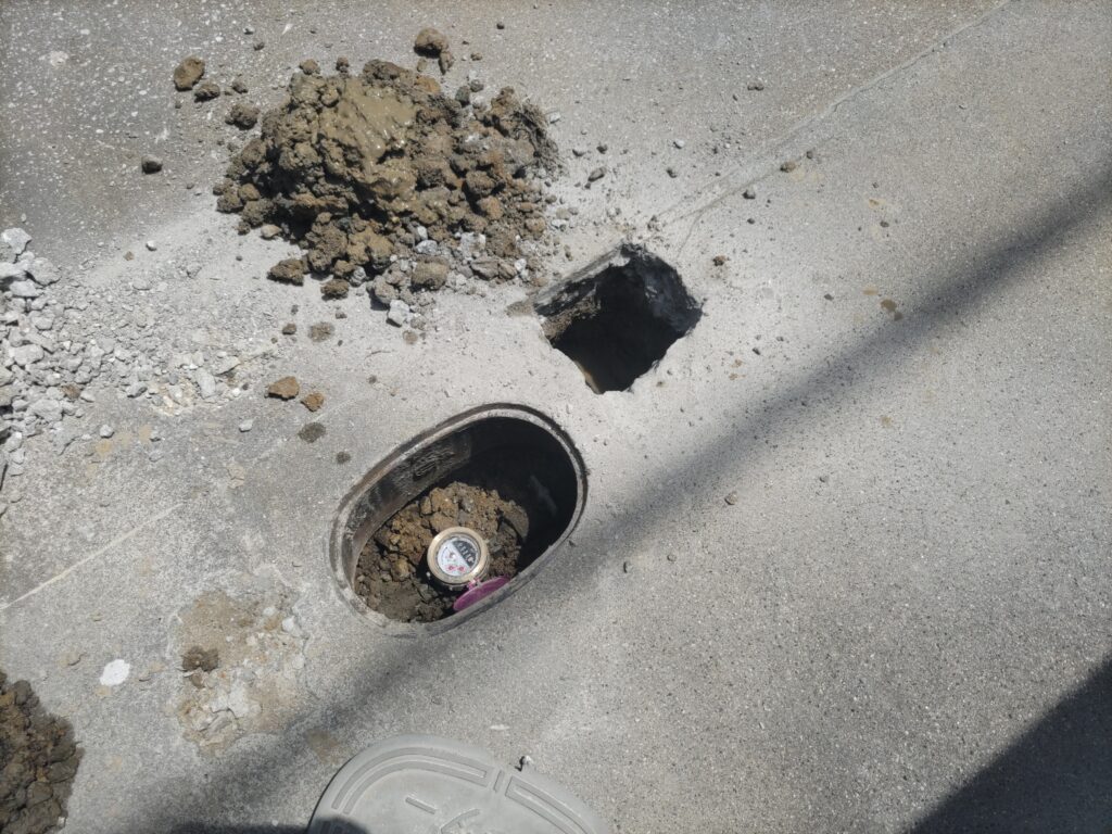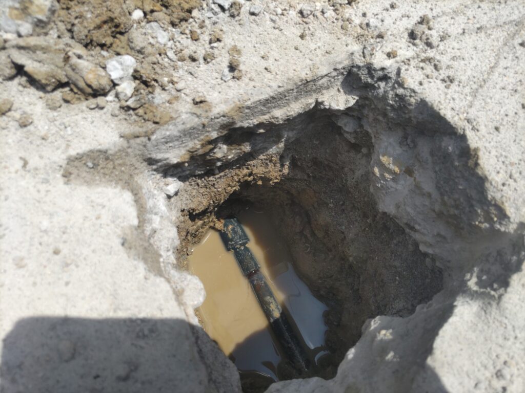 HOME > 漏水調査実例集 > 一般住宅 > 一般住宅 漏水調査実例集戸建てでの漏水量毎分約300mlの漏水調査 2025年10月25日 今回は戸建てでの漏水で漏水量は毎分約300mlでした。お客様より水道屋さんが3か所コンクリートを割り掘ってみたが、漏水場所が解らないとの事で、私どもに調査をご依頼頂きました。埋設配管での毎分約300mlの漏水状況毎分300ml程が漏水している場合、このように地中で漏水していました。これを長期に渡り放置しておくとコンクリートの下で水たまりや水の圧力で地中内の土を押し流して、空洞化が進んで行きます。水道屋さんが掘ってみた場所がコチラ調査結果での掘削結果はコチラこのような漏水は、通常の調べ方では見つけることは難しい中でなんとか見つけようと掘られたが、水が一切出てこず、残念ながら漏水場所にたどり着けなかったと考えられます。お客様にご報告して調査完了です。この度は、ご依頼頂き有難うございました。 -一般住宅, 漏水調査実例集